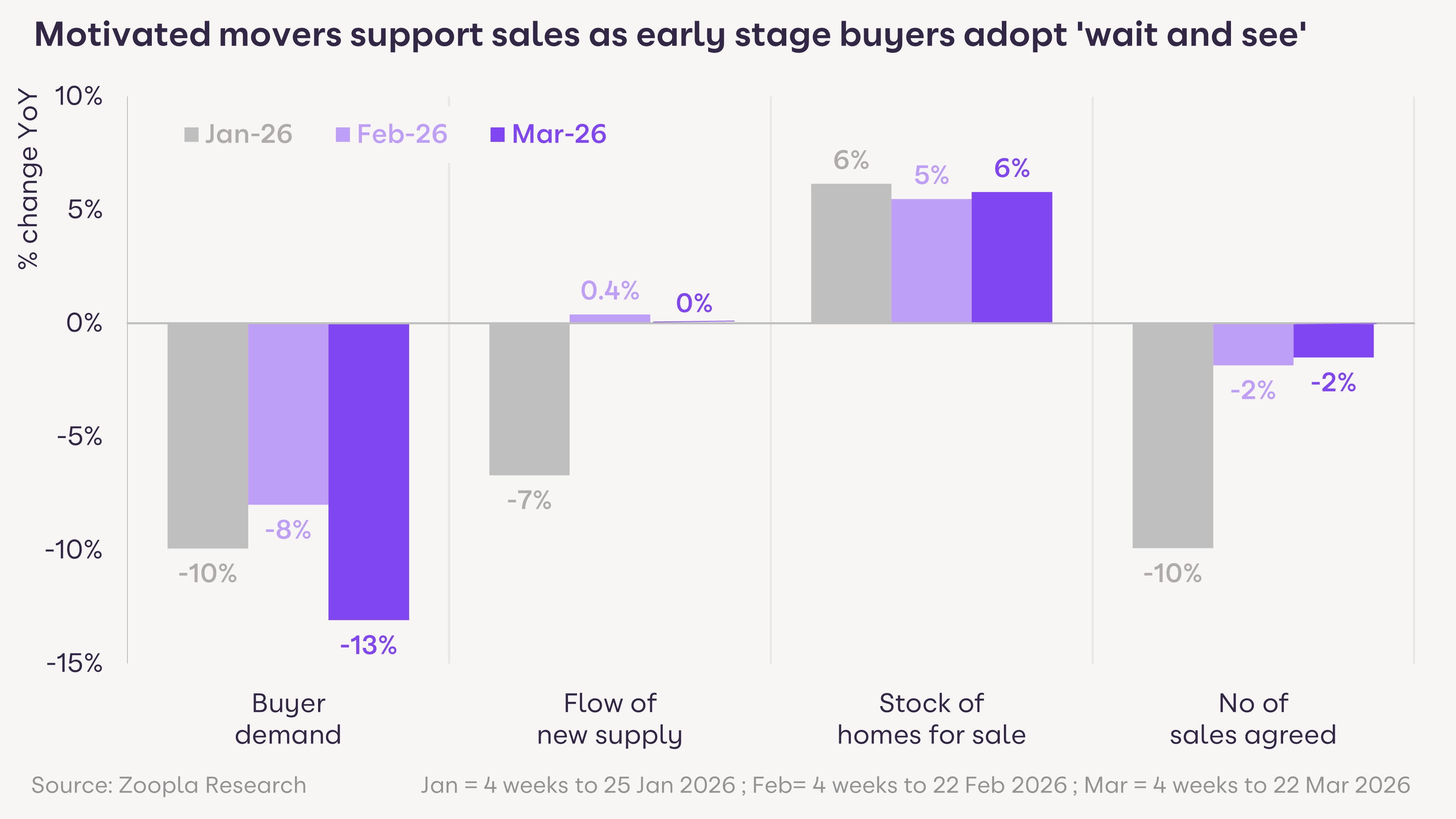 This consistency reinforces the view that the current market is being supported by a smaller pool of committed buyers rather than broad-based demand. The number of potential buyers in the market is more volatile than sales highlighting the importance of a focus on the strength of buyer intent rather than headline levels of enquiries.