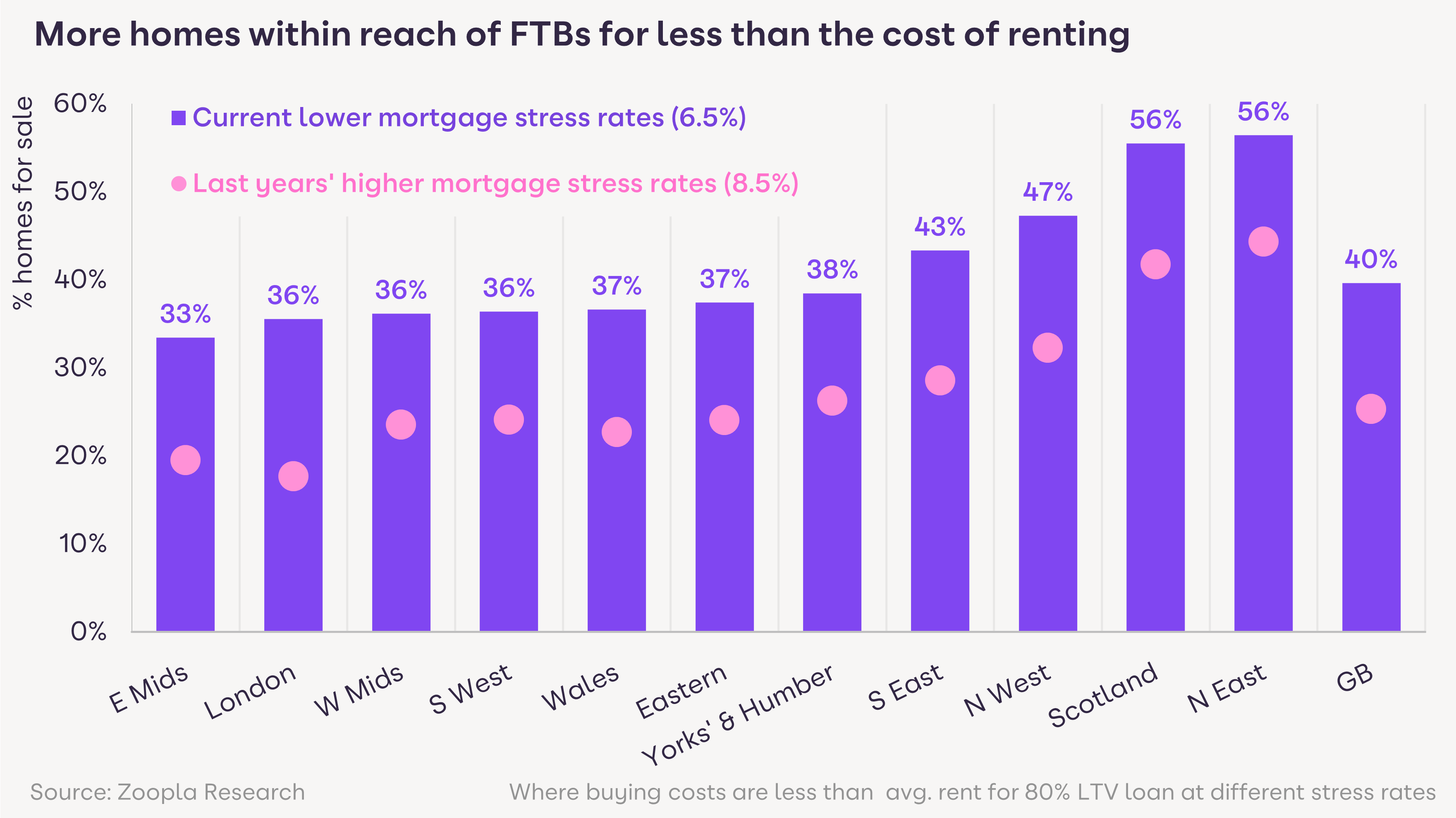 Lower stress rates mean agents can now share that 40% of homes currently for sale (on Zoopla) are cheaper to buy with a mortgage than to rent locally. This is a massive jump from just 25% of homes when tested against the higher stress rates a year ago.