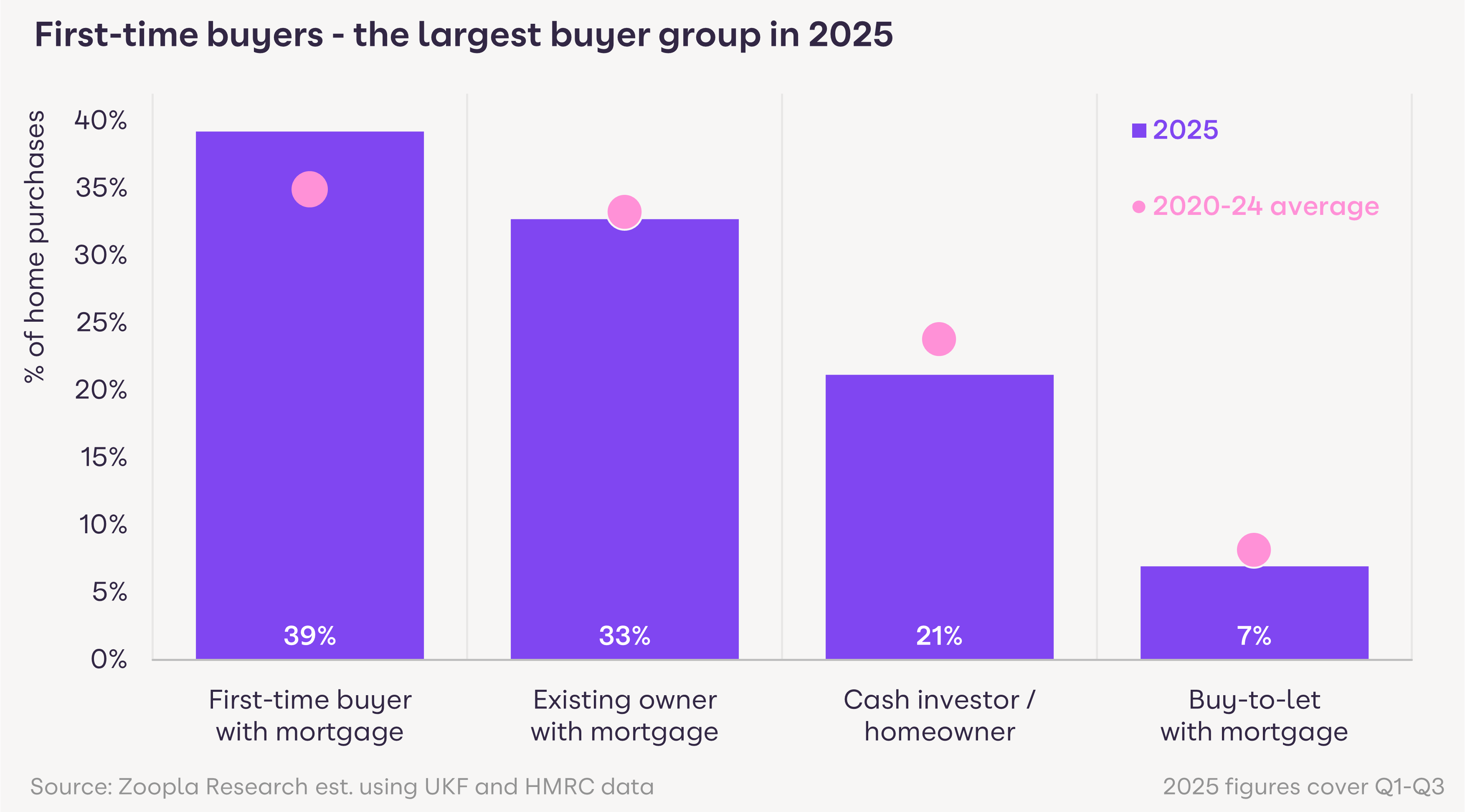 First-time buyers (FTBs) have been a driving force for increased sales and account for 2 in 5 sales. Existing homeowners buying a home with a mortgage account for 1 in 3 sales. Cash buyers account for just over 1 in 5 sales, while landlords using a mortgage account for 7% of sales