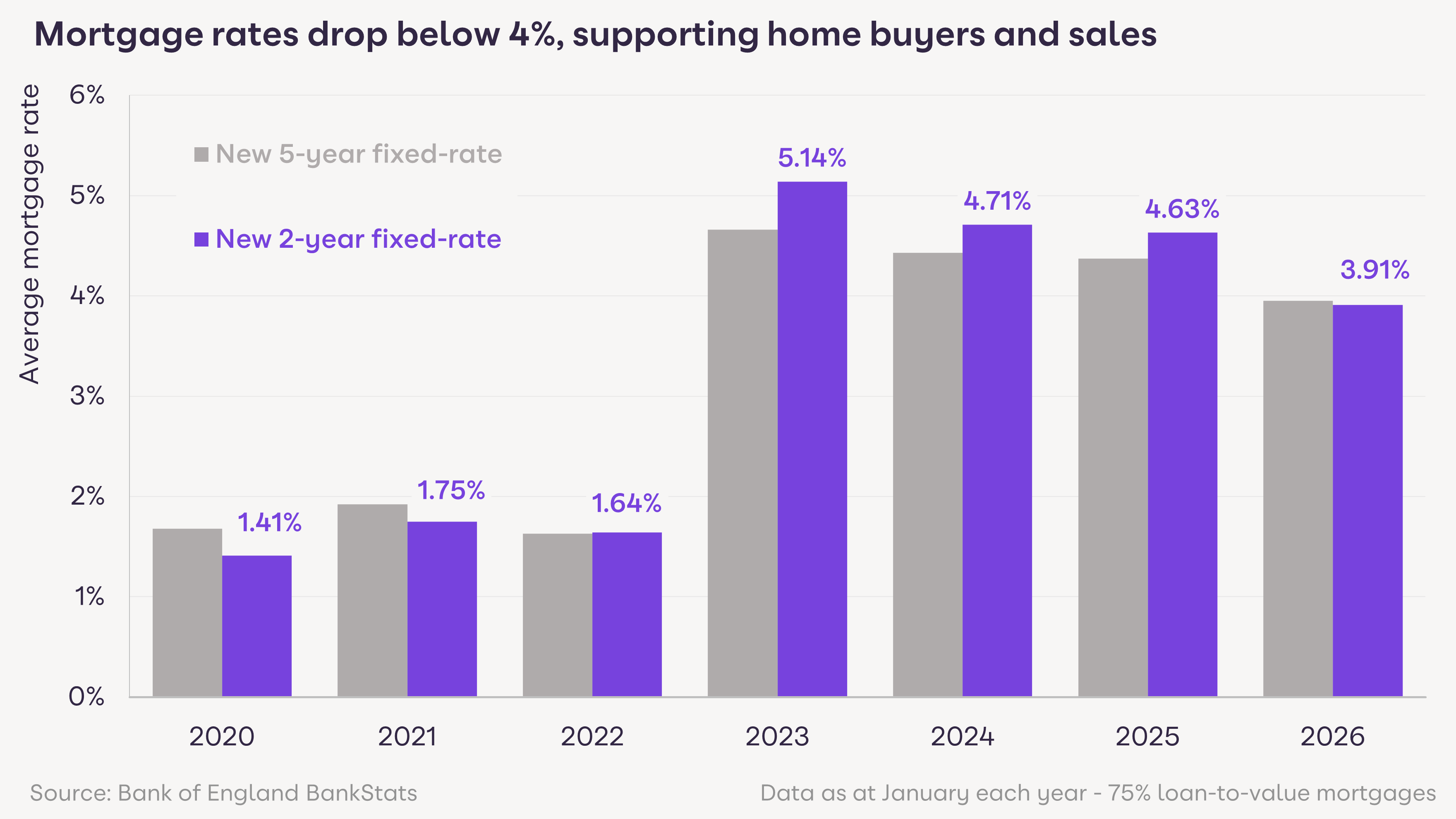 Average mortgage rates for new loans fell to their lowest level in 4 years in January. Rates on both 2-year and 5-year fixed deals are now below 4% for the first time since 2022, providing a significant boost to the market.