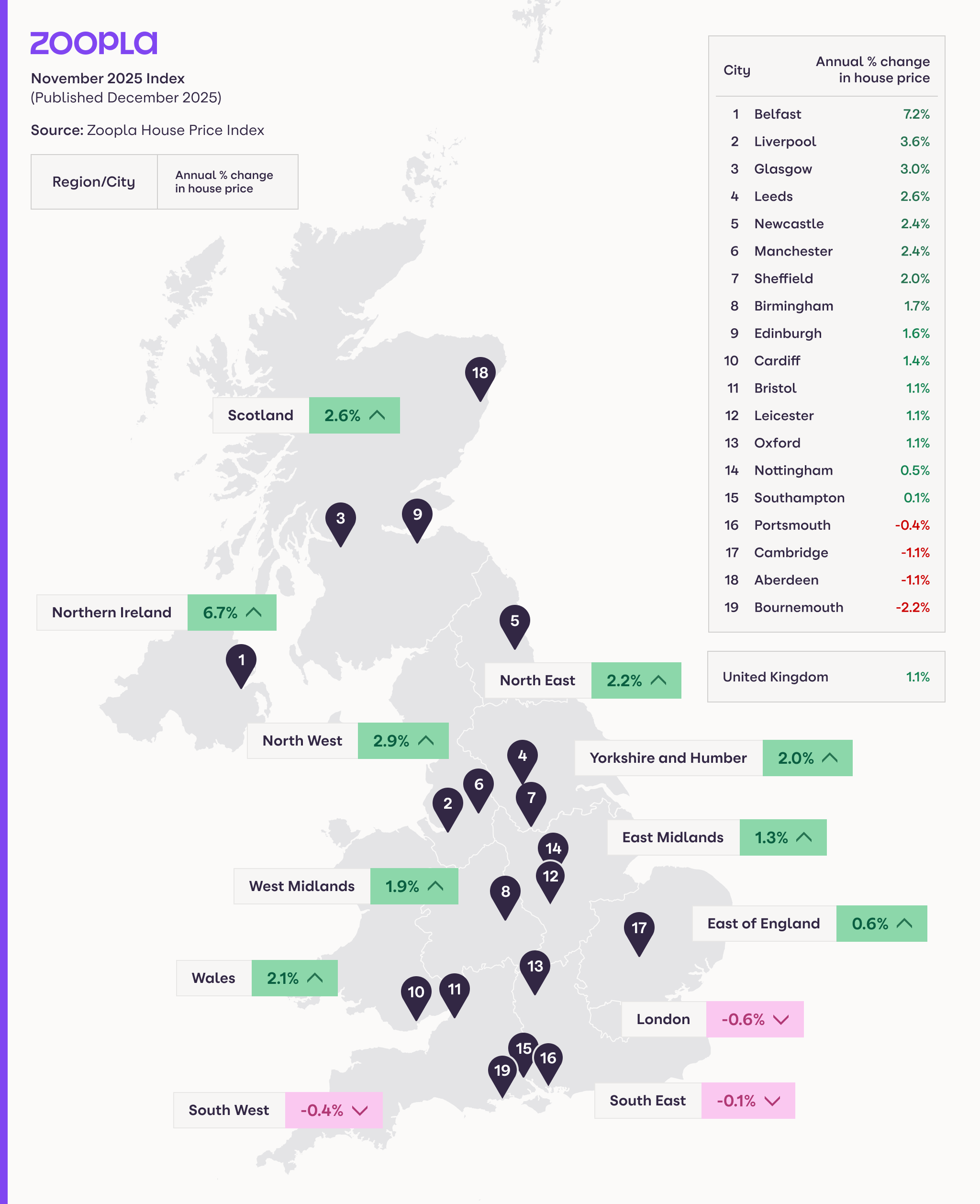A clear north–south divide persists. Prices are flat to slightly lower in southern England, down up to 0.6%, where affordability pressures are greatest. In contrast, lower prices in northern England and Scotland are supporting stronger growth, with inflation reaching 2.9% in the North West. This divide is expected to continue into 2026.