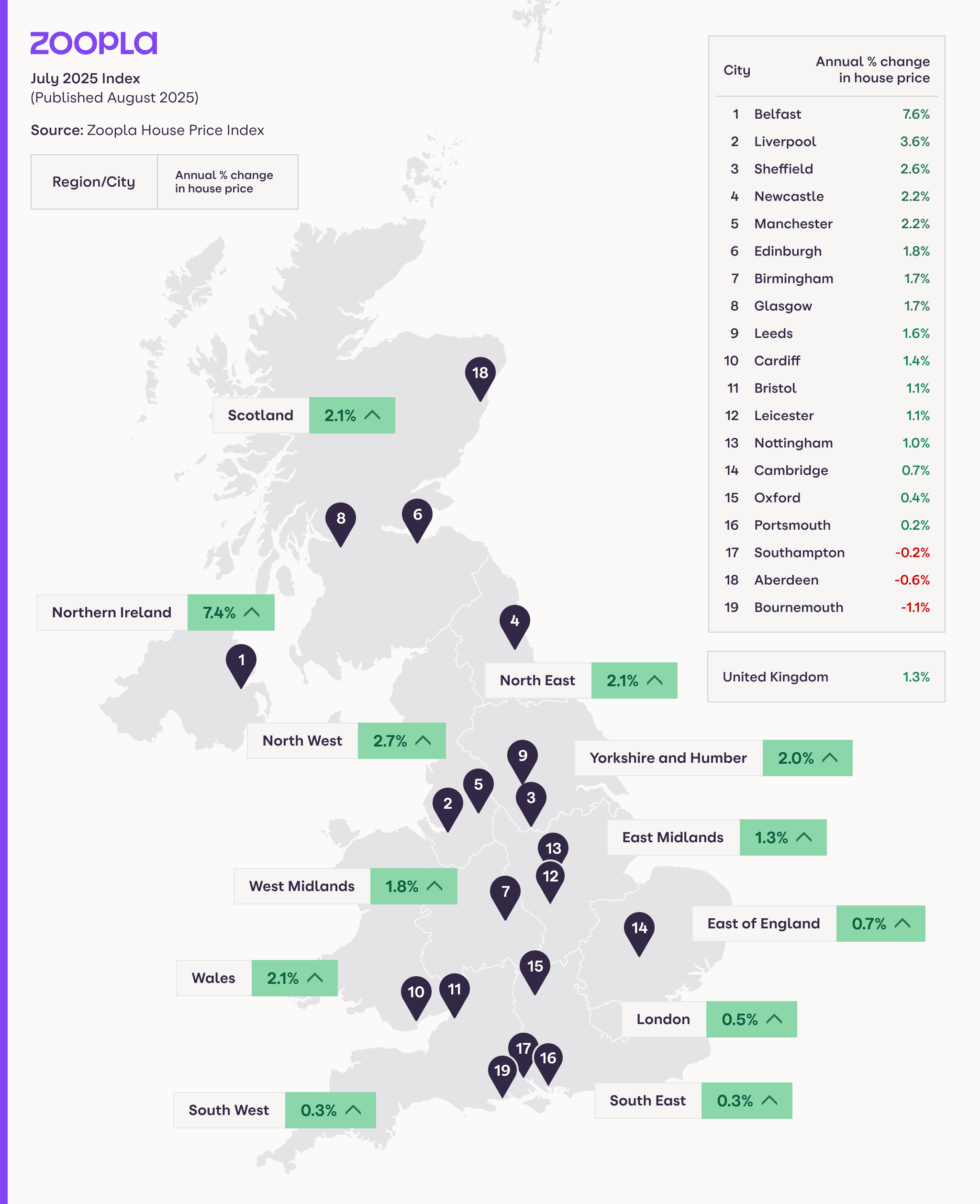 Zoopla’s House Price Index data goes up until the end of July 2025. Data on sales agreed and growth in homes for sale cover the 4 weeks to 17 August 2025 compared to the same period in 2024.